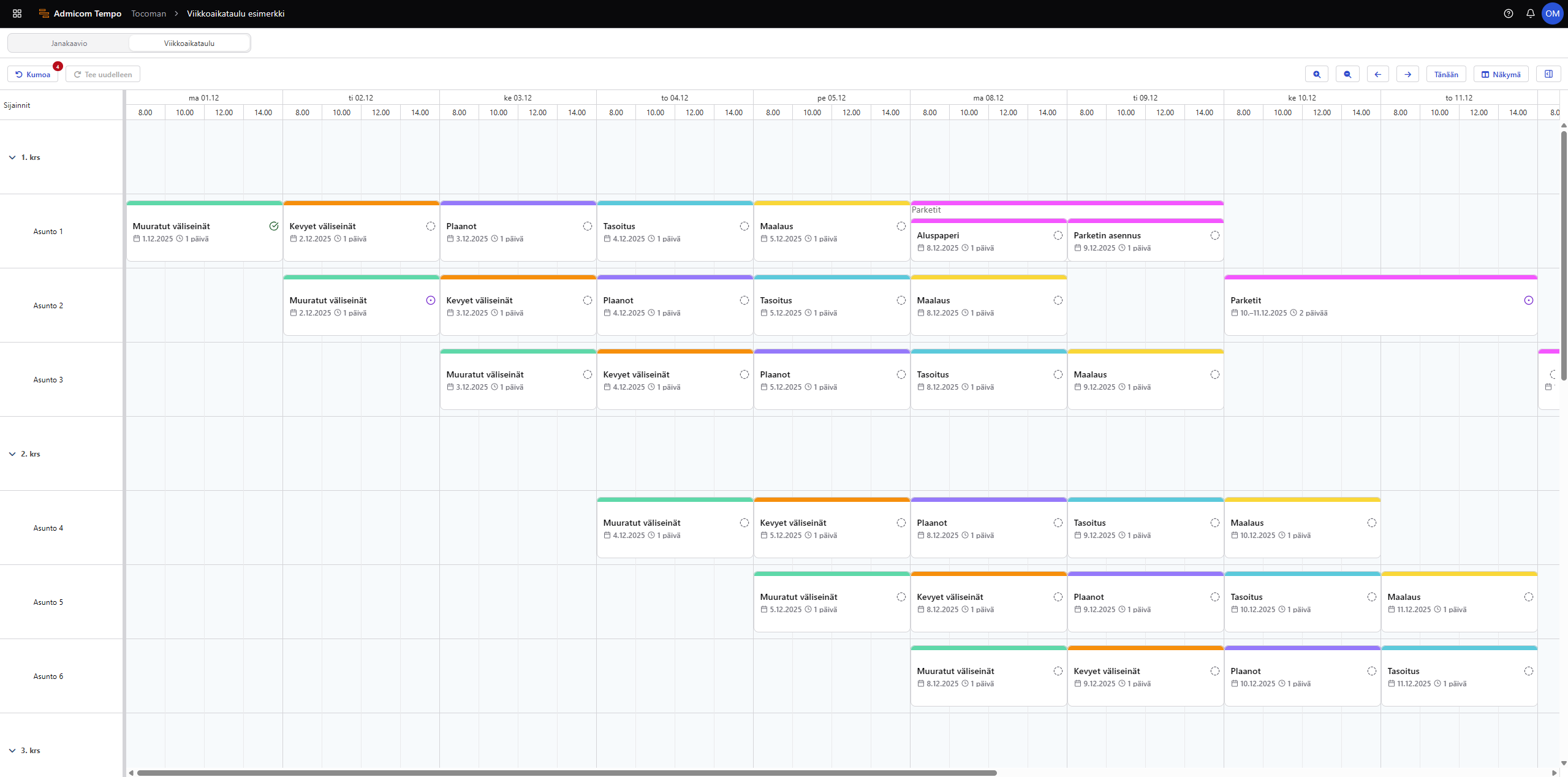 Olemme julkaisemassa Admicom Tempoon viikkoaikataulun, joka yhdistää työmaan viikkosuunnittelun ja projektin yleisaikataulun samaan järjestelmään. Tutustu Tempoon >>